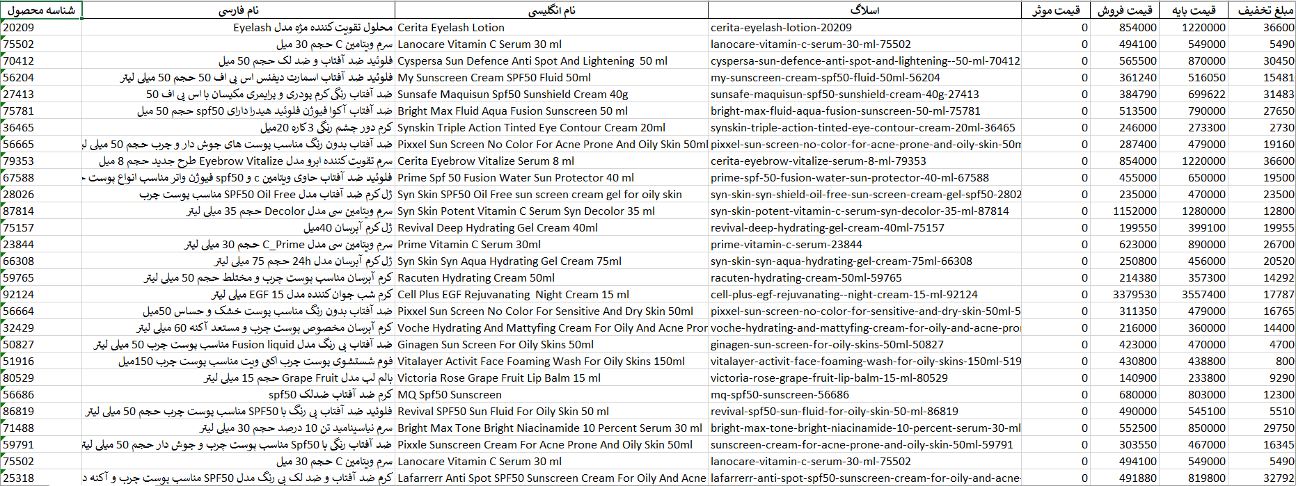 – دریافت جزئیات کامل محصولات شامل قیمت، تخفیف، امتیاز، تصاویر، توضیحات، ویژگیها، روش استفاده و تمام موارد دیگر
